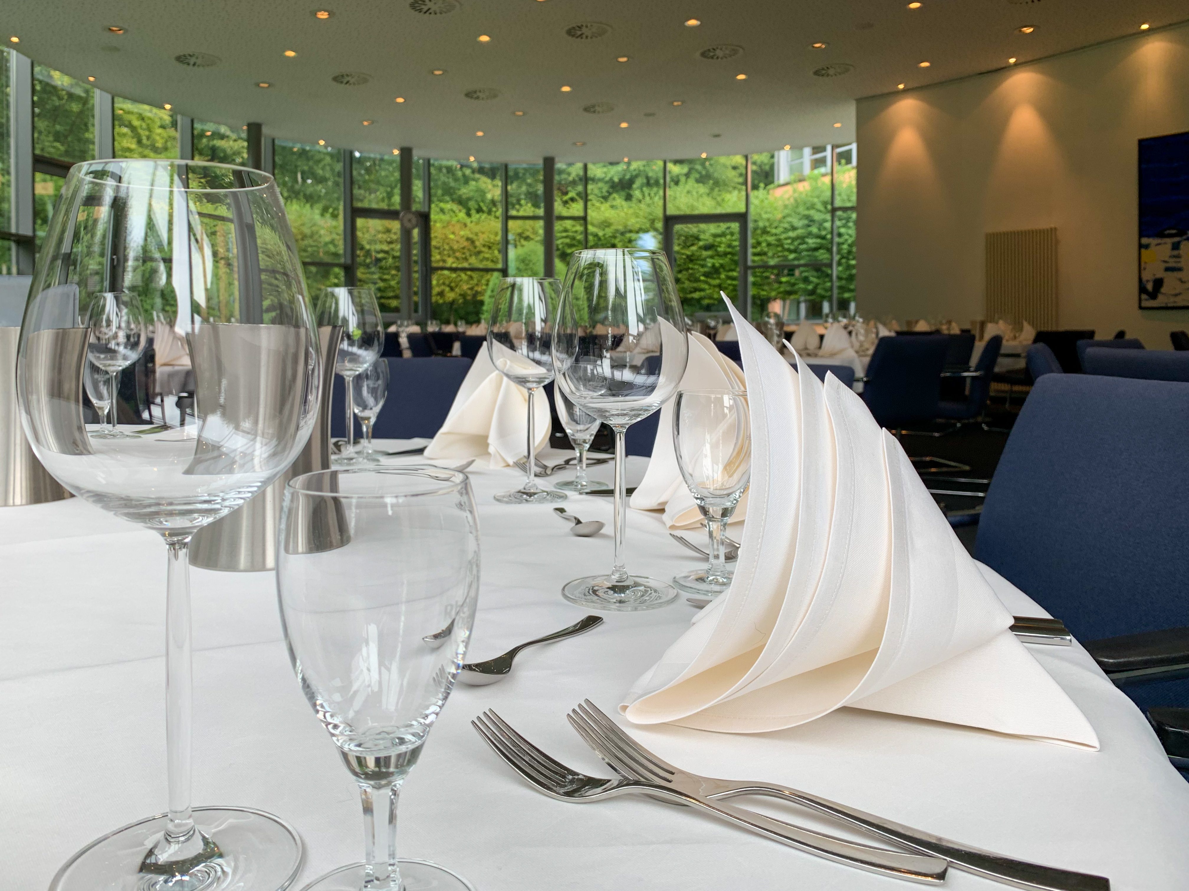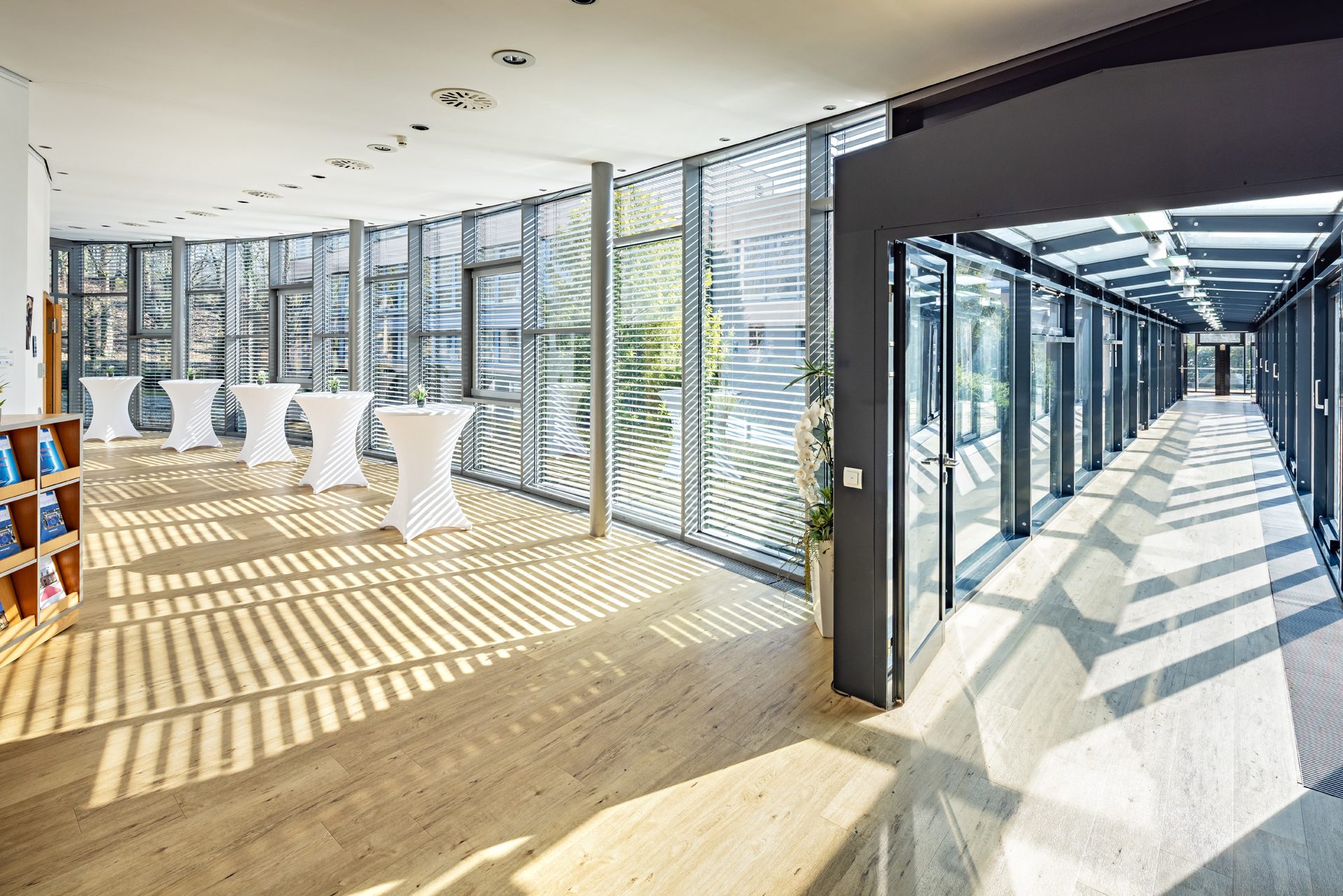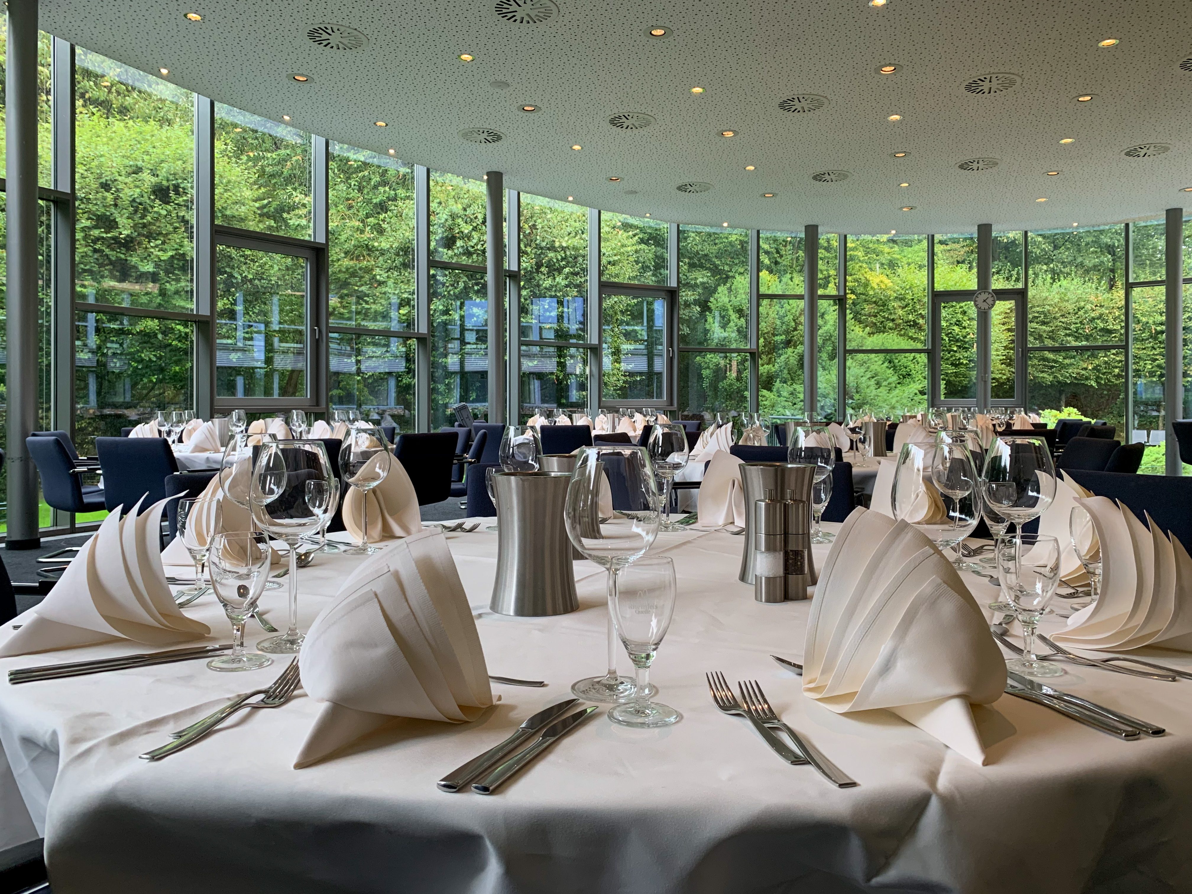 Der Lichtsaal ist der größte und variabelste Raum im HAUS DER UNTERNEHMER und bietet mit seinen großzügigen runden Tischen für 150 Gäste Platz. Am Wochenende finden hier ebenso runde Geburtstagsfeiern wie am Abend Hochzeitsfeiern statt. Dafür wandelt der Lichtsaal schnell sein Gesicht: Kaum ist das Menü verspeist, ist der Boden für den Eröffnungstanz bereitet. Das festliche Bankett im Lichtsaal mit ungetrübtem Blick in den blühenden Garten – was kann es Schöneres an besonderen Tagen geben? Der 200 qm große, klimatisierte, abdunkelbare und barrierefreie Lichtsaal ist mit Beschallungsanlage, Mikrofonen, Bühnenaufzug, Lichtspots und Teppichboden ausgestattet.