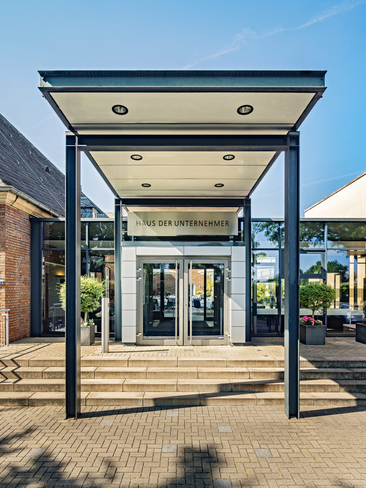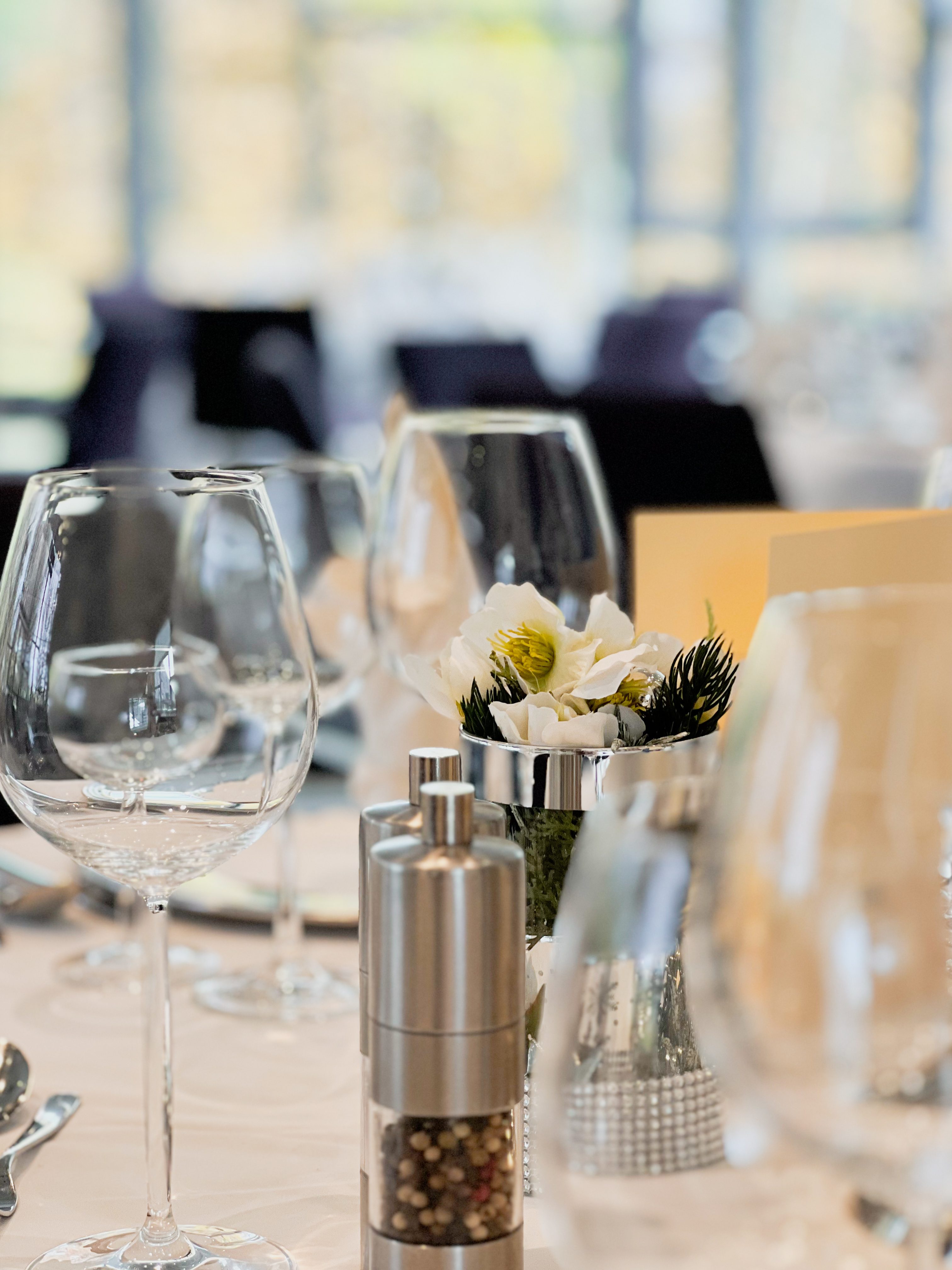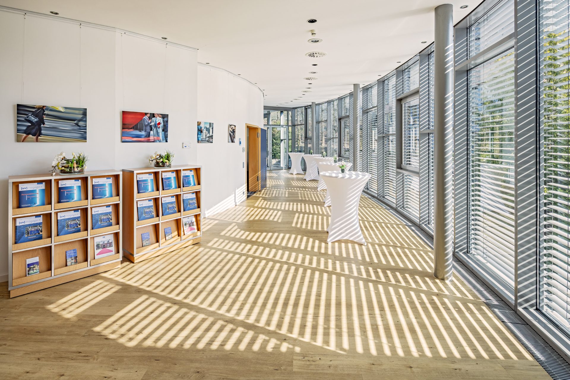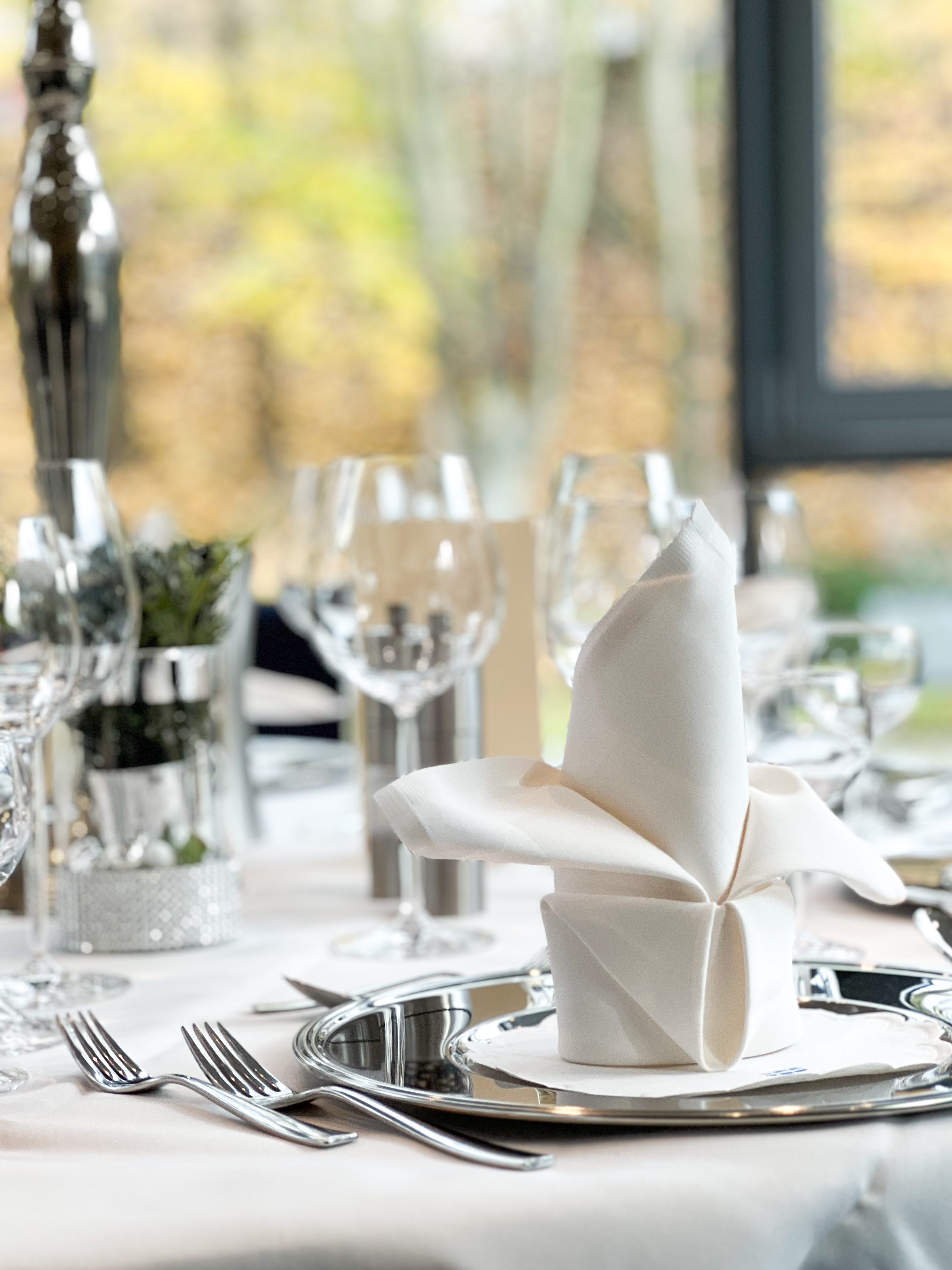 Der Lichtsaal ist der größte und variabelste Raum im HAUS DER UNTERNEHMER und bietet mit seinen großzügigen runden Tischen für 150 Gäste Platz. Am Wochenende finden hier ebenso runde Geburtstagsfeiern wie am Abend Hochzeitsfeiern statt. Dafür wandelt der Lichtsaal schnell sein Gesicht: Kaum ist das Menü verspeist, ist der Boden für den Eröffnungstanz bereitet. Das festliche Bankett im Lichtsaal mit ungetrübtem Blick in den blühenden Garten – was kann es Schöneres an besonderen Tagen geben? Der 200 qm große, klimatisierte, abdunkelbare und barrierefreie Lichtsaal ist mit Beschallungsanlage, Mikrofonen, Bühnenaufzug, Lichtspots und Teppichboden ausgestattet.
