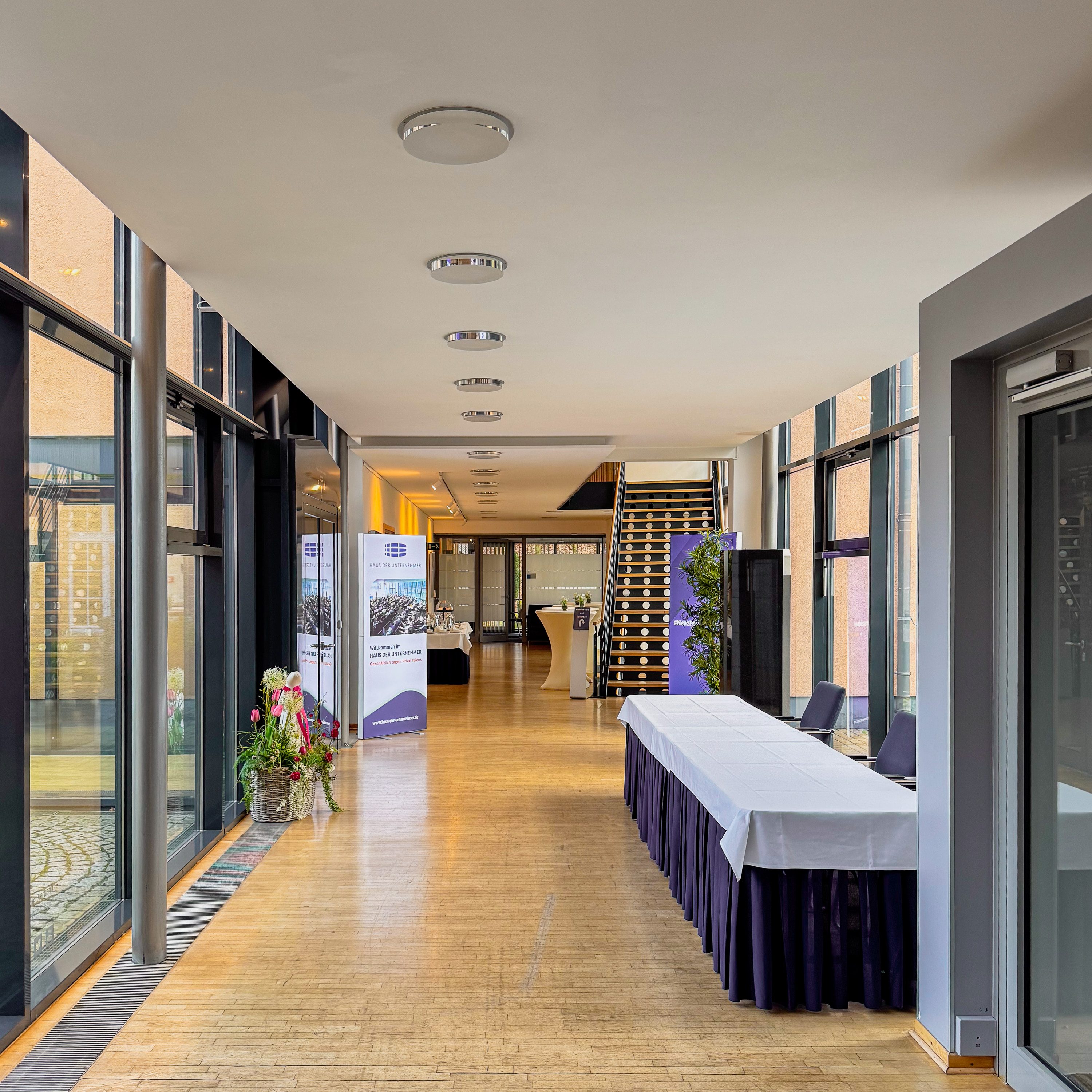 Werden Sie Gastgeber im HAUS DER UNTERNEHMER: Empfangen Sie Ihre Gäste vor dem historischen Eingang, bauen Sie das Buffet unter Zelten auf unserem Parkplatz im Grünen auf, gehen Sie in der Pause spazieren durch unsere Lavendelanlage, speisen oder tagen Sie auf der einladenden Sonnenterrasse. Auch rund um das Haus gibt es viele Möglichkeiten für die Gestaltung Ihres Events!