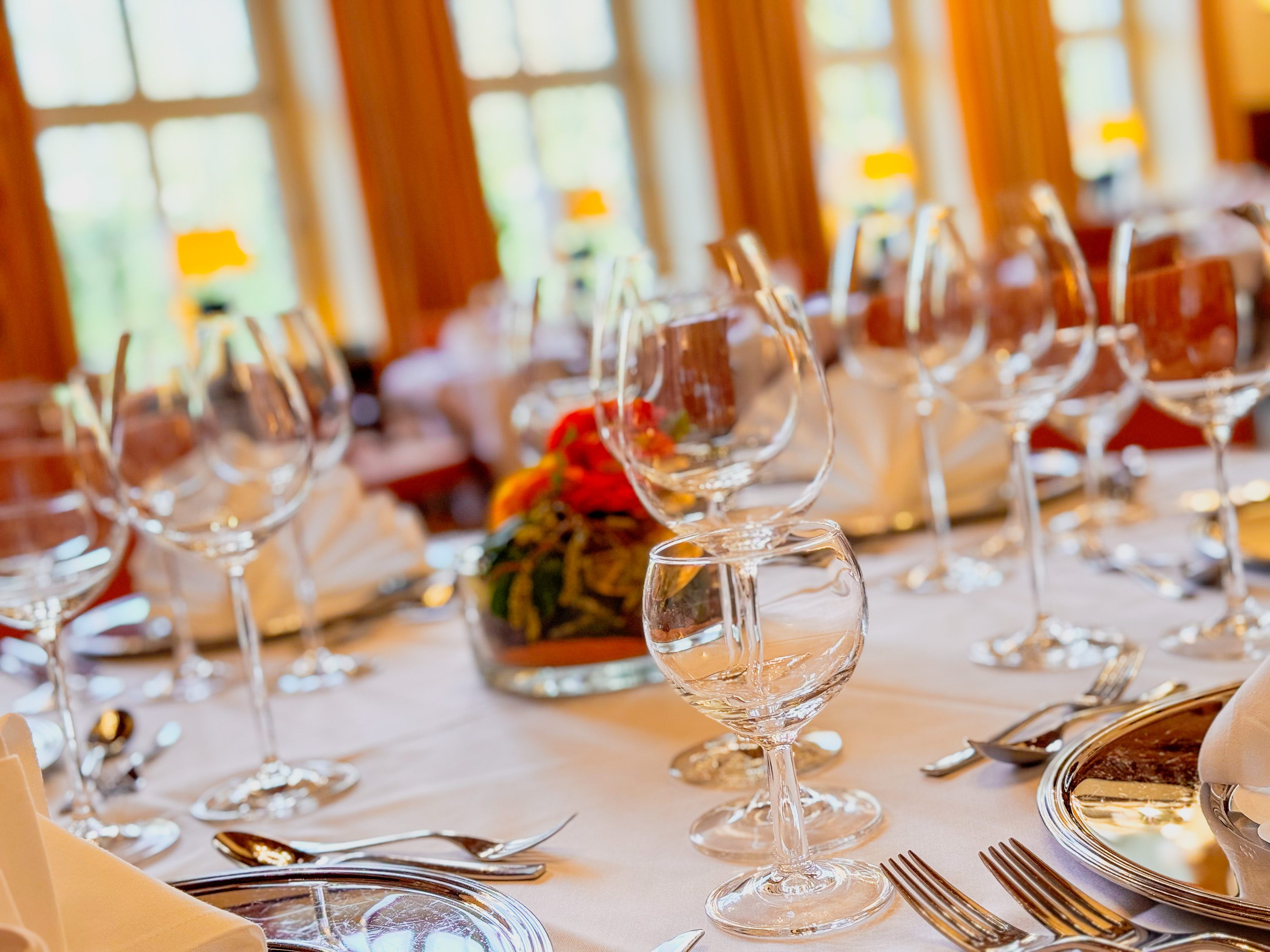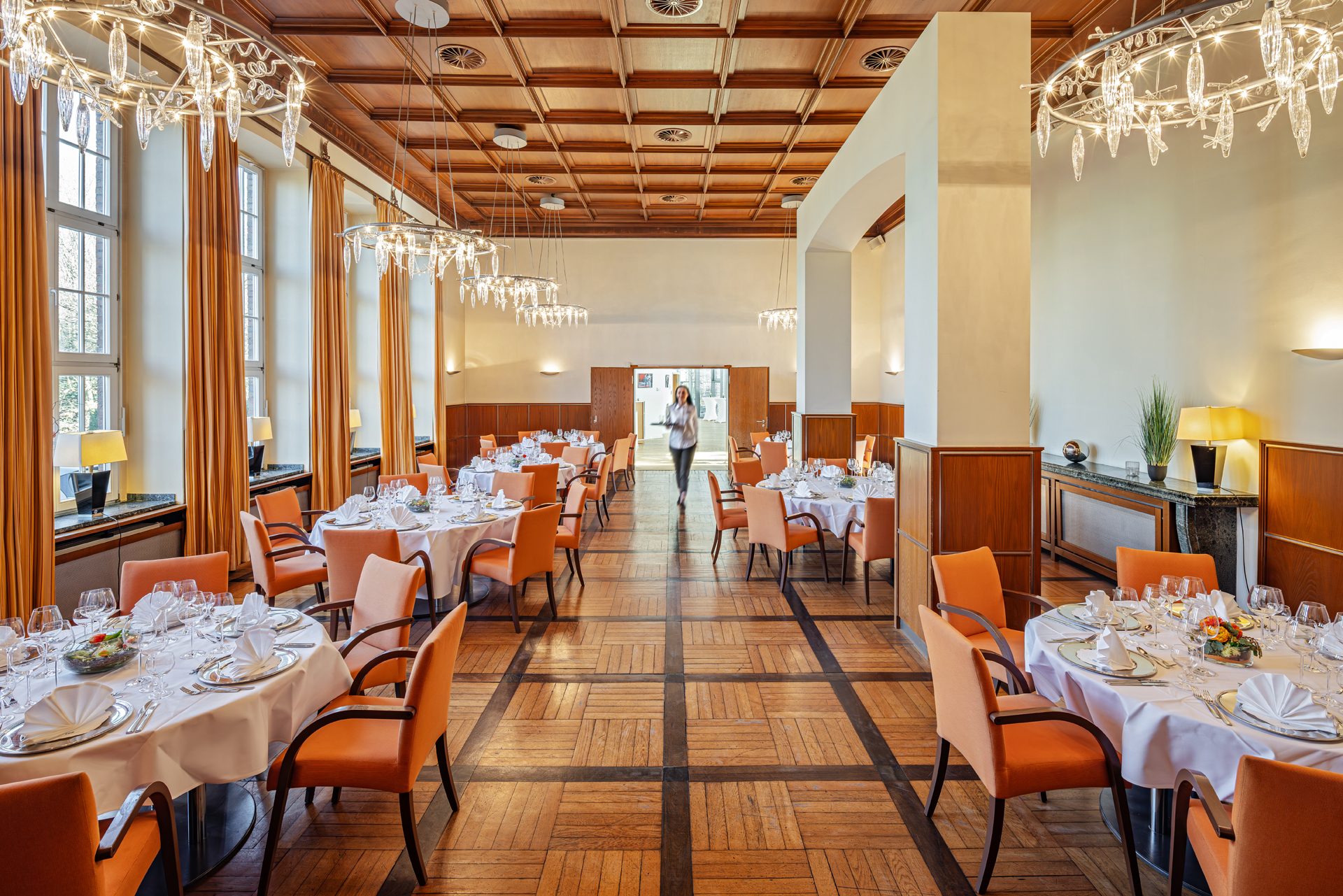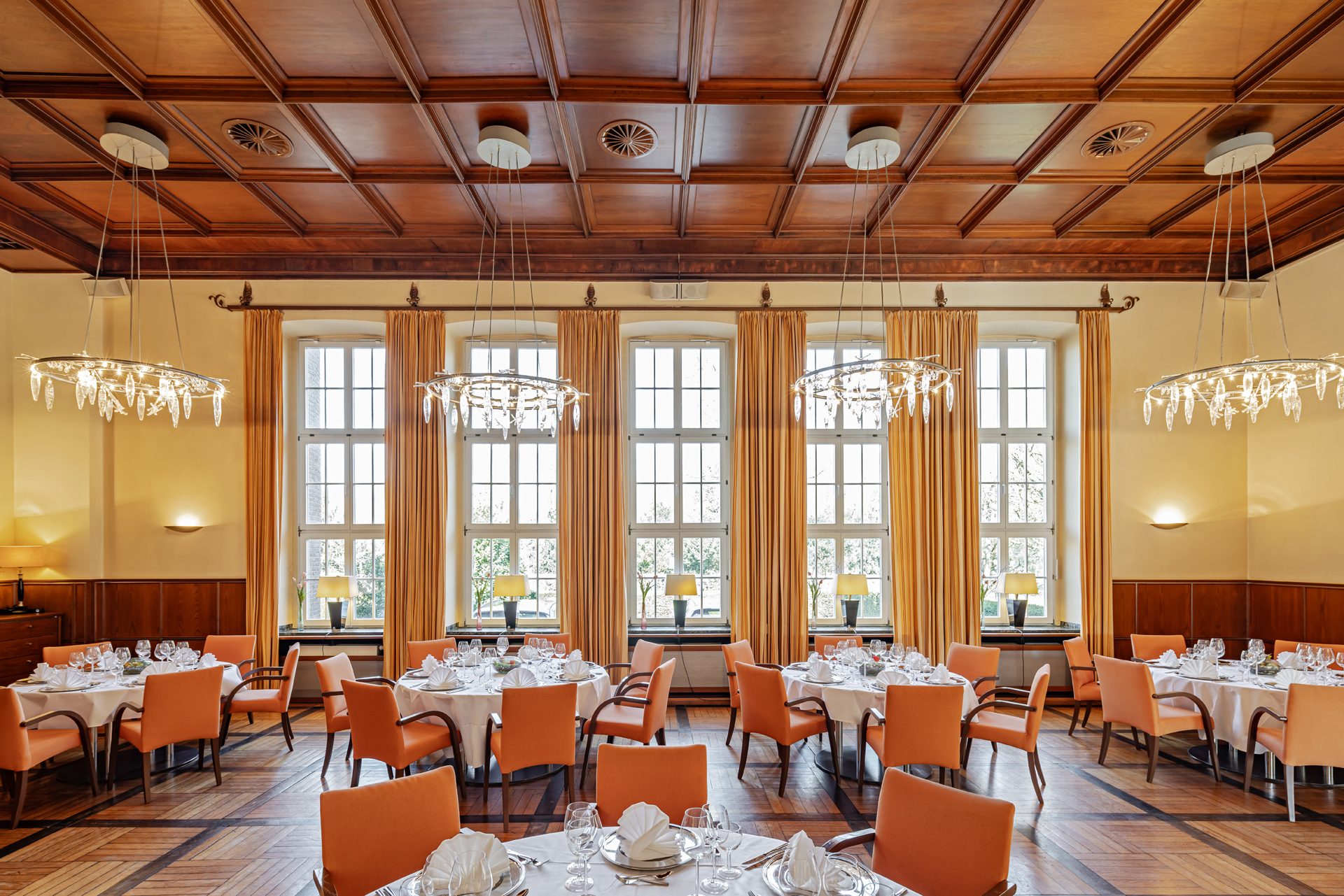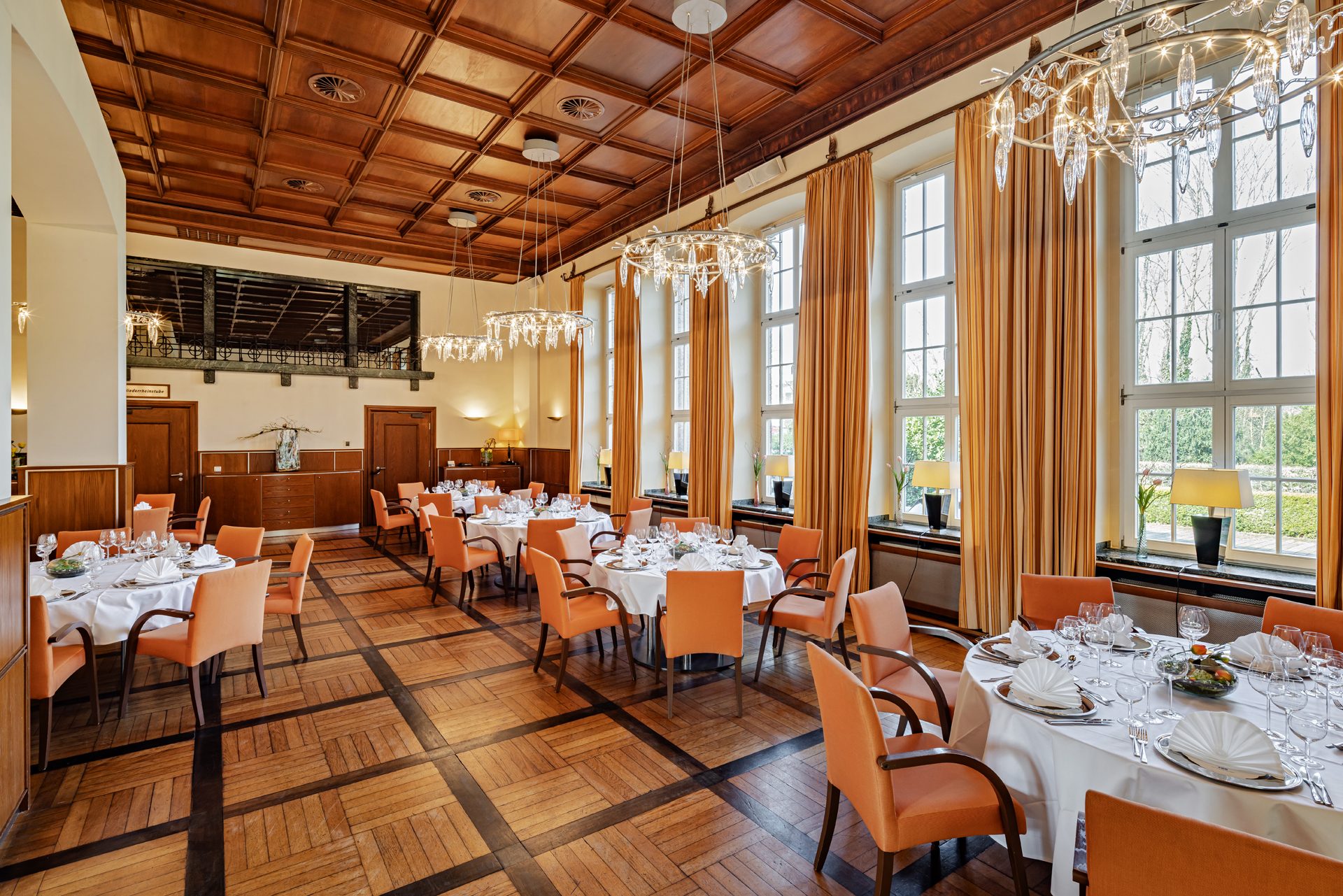 Ob leichtes Buffet oder exklusives Menü – der Raum eignet sich ideal für kulinarische Pausen während Tagungen oder auch als festlicher Ballsaal mit ausladenden Leuchtern für Abendveranstaltungen. Dabei bietet die historische Kulisse Ihrer Gesellschaft einen architektonisch reizvollen Rahmen, der in der Region seinesgleichen sucht. Hier tagten früher die Offiziere der Britischen Rheinarmee, der denkmalgeschützte Raum ist mit vielen Original-Ausstattungen erhalten.