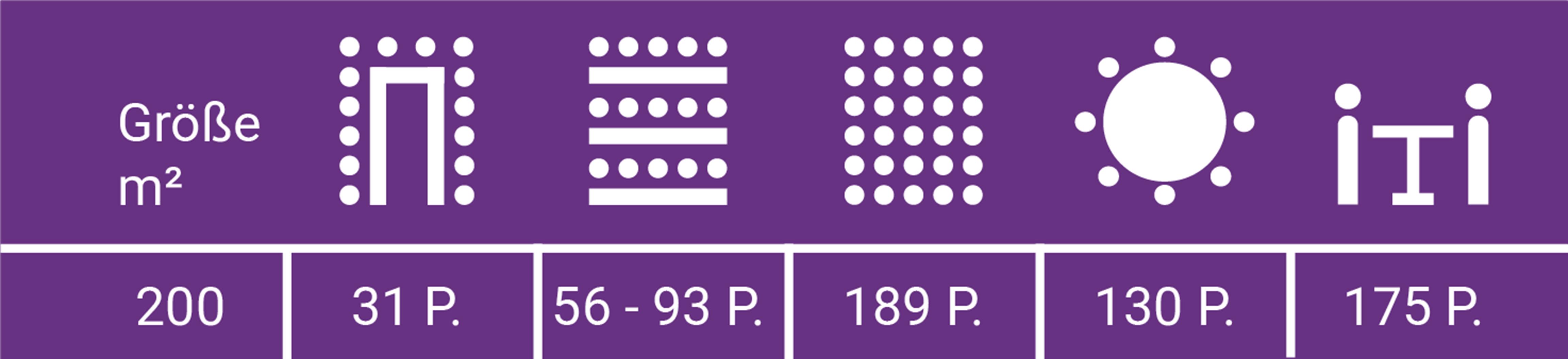 Dank flexibler Bestuhlungsoptionen bietet der Raum Platz für: