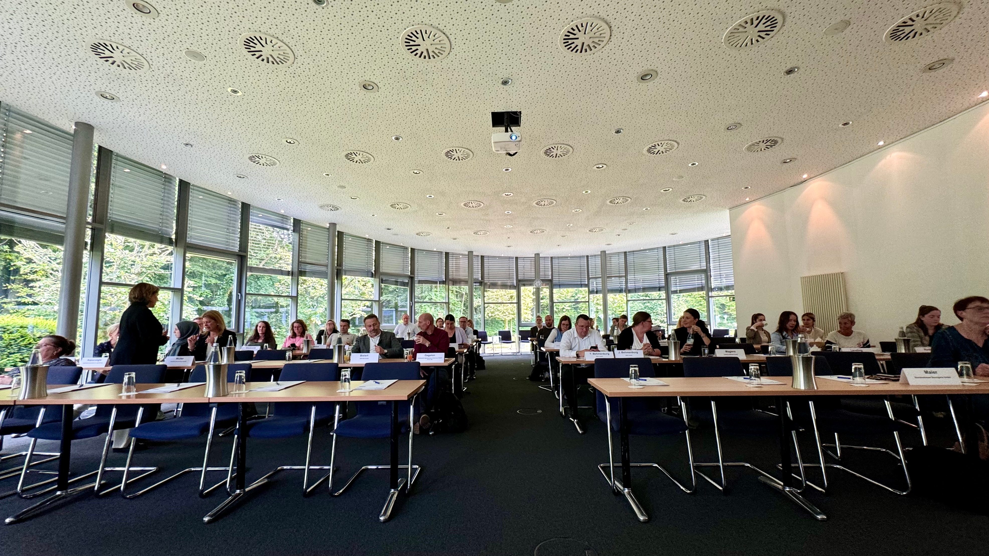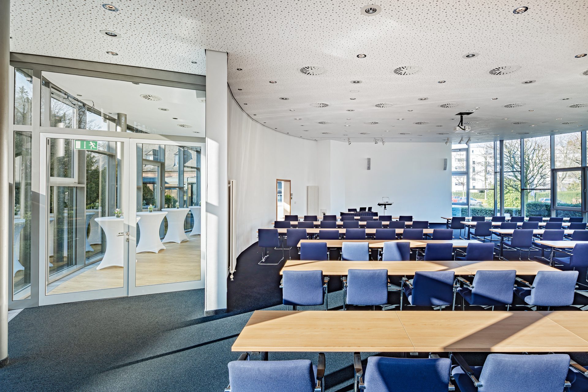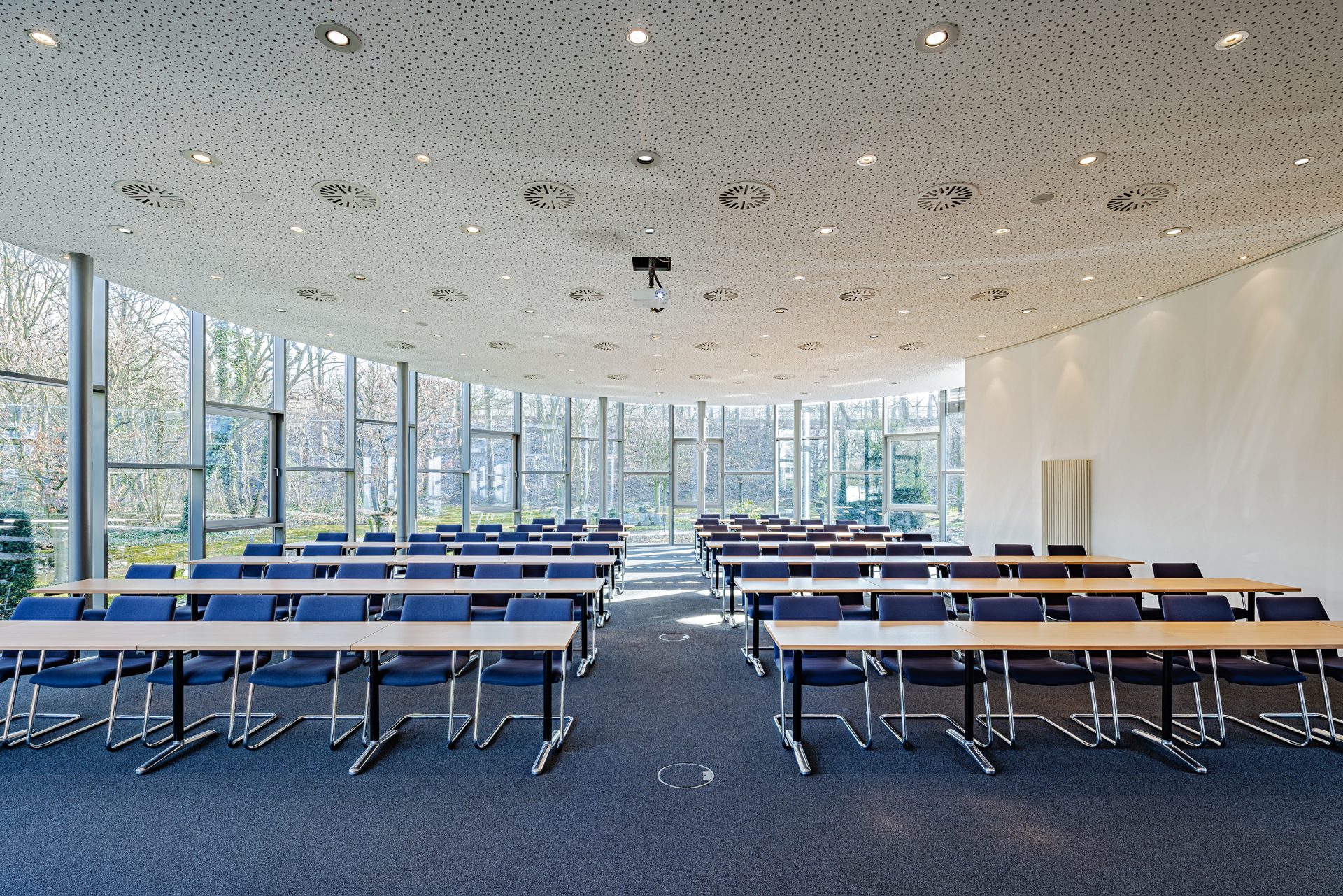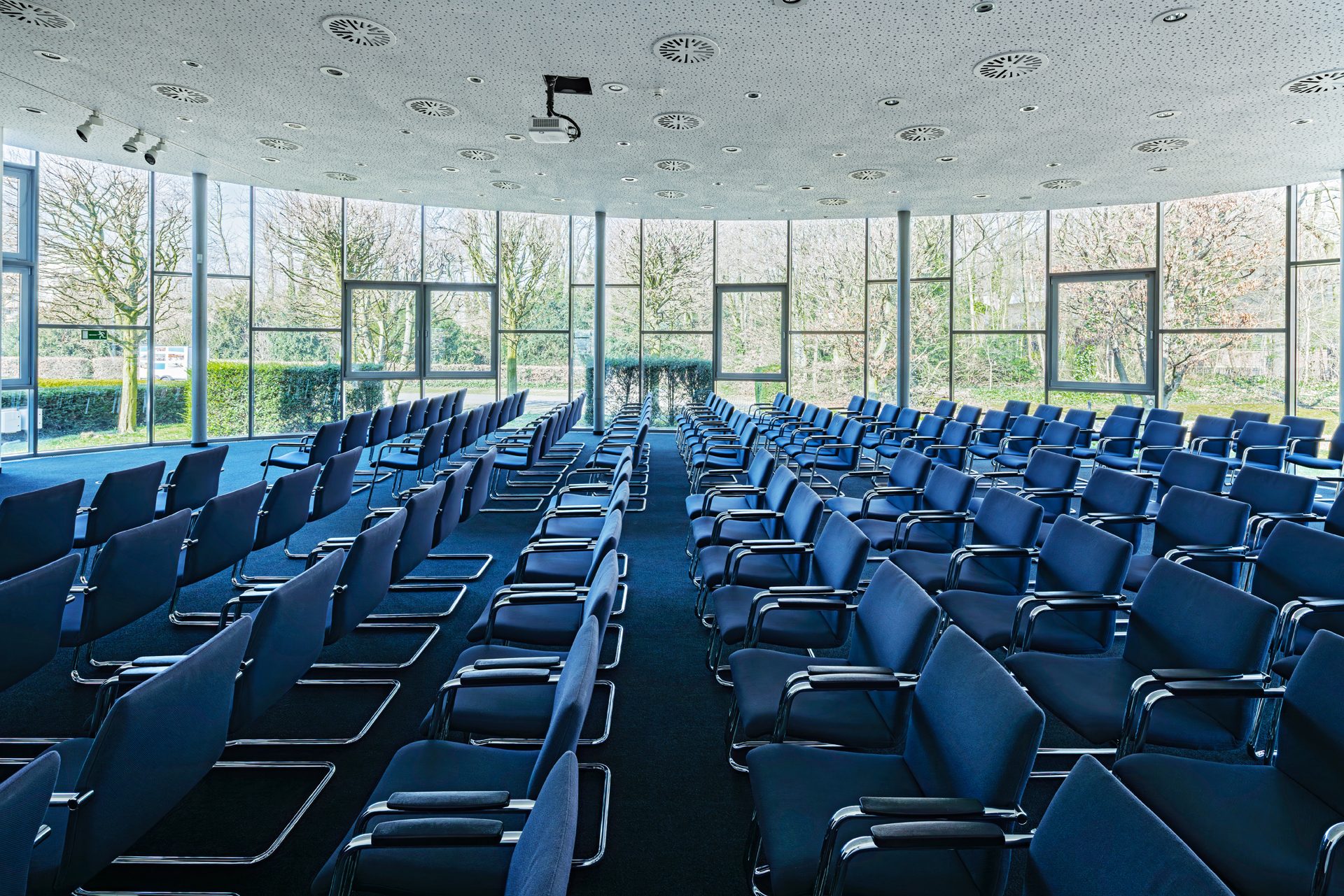 Ob Tagung, Kongress, Seminar, Workshop oder Verhandlungsrunde – im Raum Duisburg finden Sie auf 200m² den idealen Rahmen für Ihre Veranstaltung, inklusive viel Tageslicht und Blick ins Grüne. Eine in der Rhein Ruhr-Region einzigartige Möglichkeit dieses Raums ist es, ihn mit einem so genannten „Uno-Tisch“ auszustatten. XX Personen haben im Kreis sitzend so die Möglichkeit, auch in großer Runde eine Vis-à-Vis-Gesprächssituation einzunehmen.