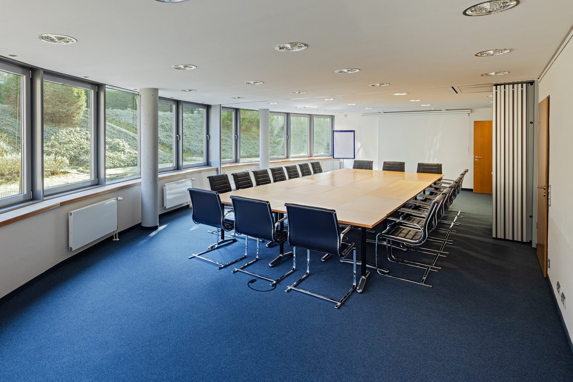 Der abdunkelbare Raum im Untergeschoss ist barrierefrei und mit Präsentationswand, Teppichboden, Telefonanschluss und W-LAN ausgestattet. Auf Wunsch kann er durch eine Trennwand in zwei Raumeinheiten unterteilt werden – ideal für Gruppenarbeiten oder parallele Programmpunkte.